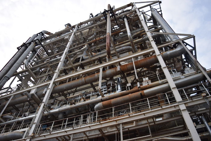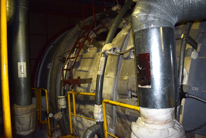 建屋の外へ出ると、ガスタービンからつながる排熱回収蒸気発生器が高くそびえていた。ガスタービンからの排ガスがここに送られ、蒸気を作り、別のタービンを回す。まさにコンバインドサイクル発電システムを擁した火力発電所そのものなのだ。
