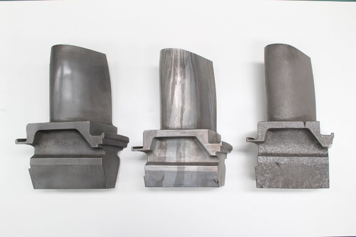 右から普通鋳造、中央が一方向凝固、左が単結晶という技術で鋳造したタービン翼。これを円形に並べてタービンを形成する。