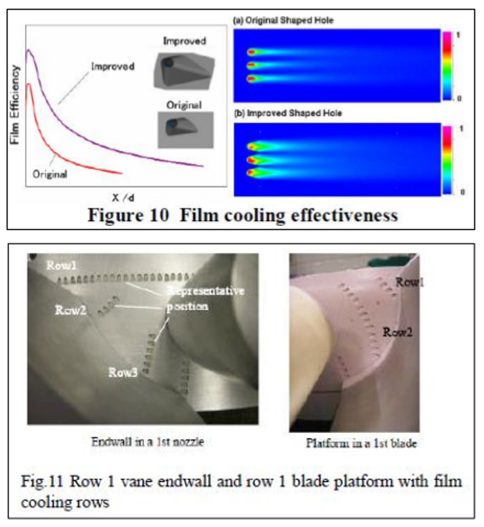 続いては、1600℃級ガスタービンの実用化に大きく貢献したフィルム冷却技術。空気が通る穴を開け、タービン翼自体の温度を下げる。穴の形状は翼を冷やすための表面積を広げるため、円ではなくアヒルの足のような形をしている。