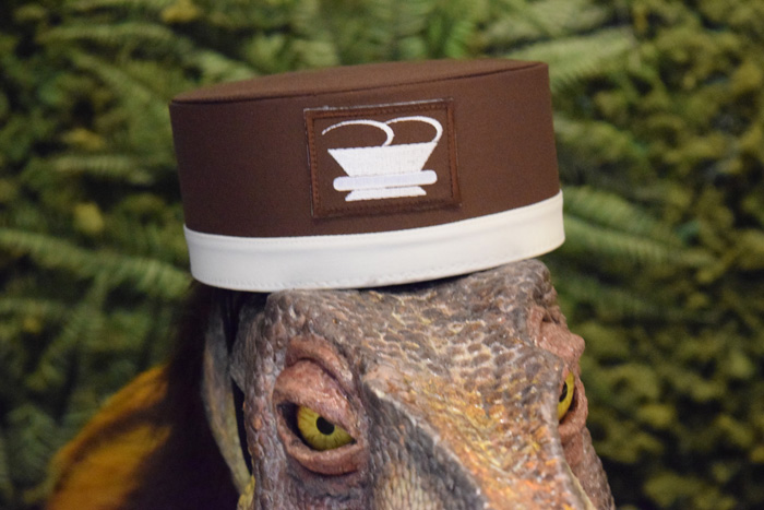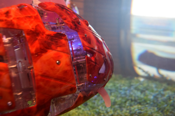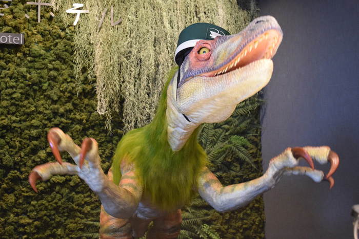 ロボットによる受付だ。先ほどのティラノサウルスはオブジェだが、こちらの恐竜は動き、話す。心地の良いバリトンボイスで日・英・韓・中の4カ国語を操る彼らが、このホテルのフロントマンで、顔役である。