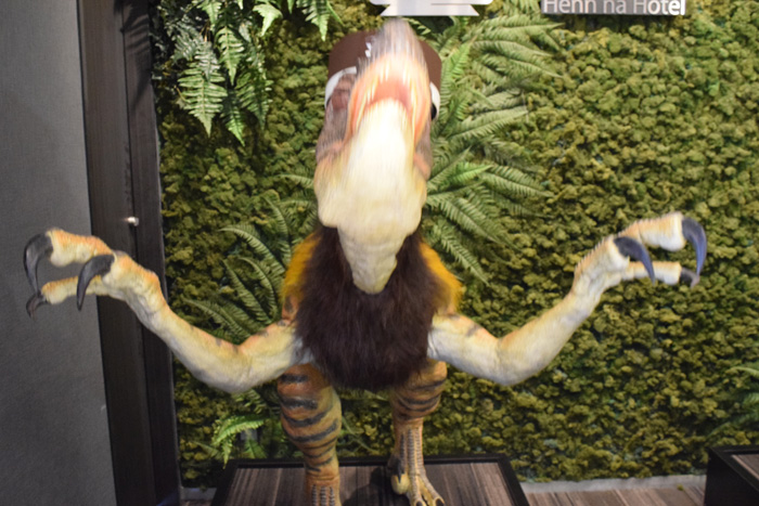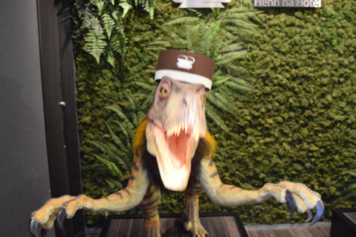 このフロントに立つ2体の恐竜ロボットをはじめ、このホテルでは、9種140体のロボットが働いている。