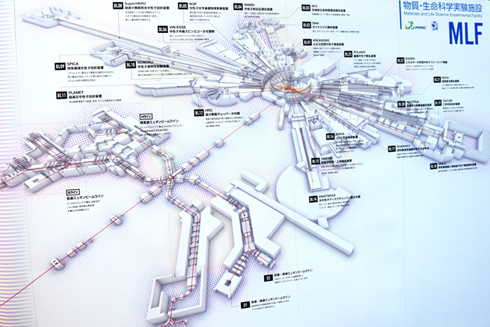 J-PARCの物質・生命科学実験施設配置図。この施設で生成された中性子ビームは、各所に設置された実験装置に運転期間中はほぼ24時間供給される