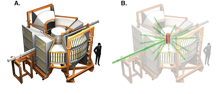 2009年から3年の歳月を経て建設されたSPICA(イメージ図)。直径4m、中心部に対象物を設置し、加速器によって作り出された中性子がビームラインから装置へ発射される