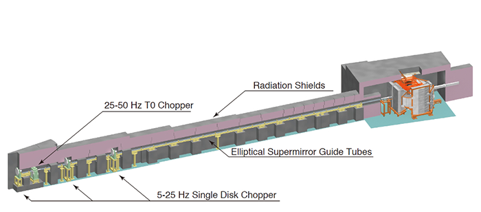実験室内部は、中性子ビームの照射部を含めて全長60mほど。青い壁の内部には稼働中のSPICAが設置されている