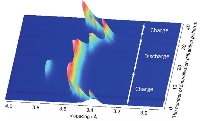 SPICAで検出できるデータの一部。充電時と放電時に負極材料(黒鉛)にリチウムイオンが挿入されることで、黒鉛の構造が変化している様子を視覚化