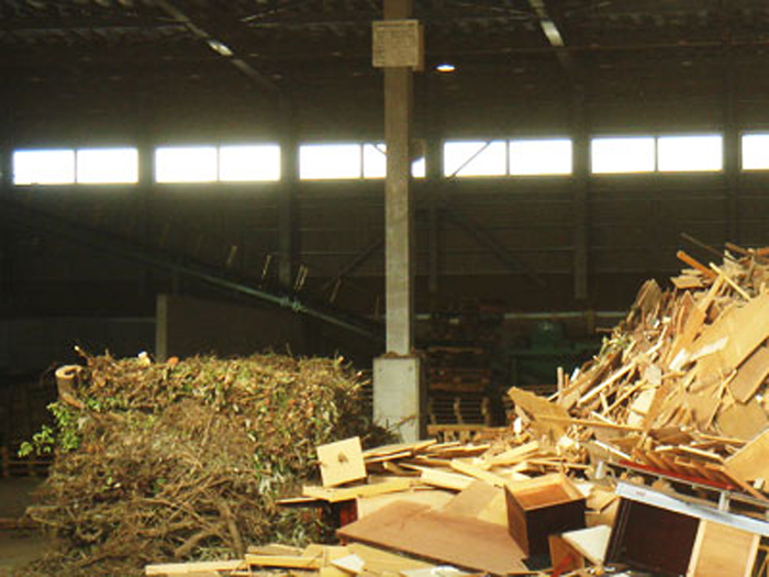次から次へとトラックで運び込まれる建設廃材にはくぎや金具がそのまま付いていたりしますが、木質燃料リサイクル工場(図8)の中でいくつかの工程を経て取り除かれ、最後は木材だけに仕分けされ木質チップに成形されます。1日に約200tの廃材が粉砕されています。