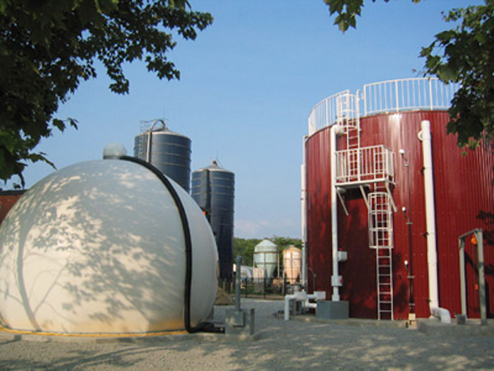 くずまき高原牧場内の牛の排せつ物を発酵させてメタンガスを抽出し、発電ならびに熱回収を行うシステム。