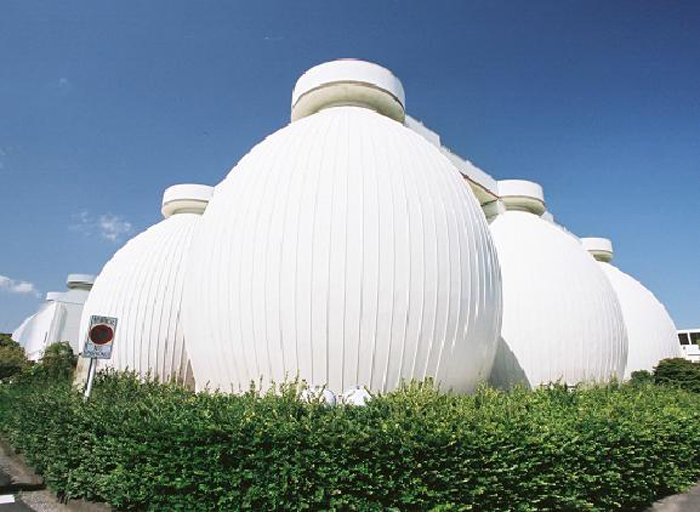 左の白い丸い建物がガスホルダー、右の赤い建物がメタン発酵槽