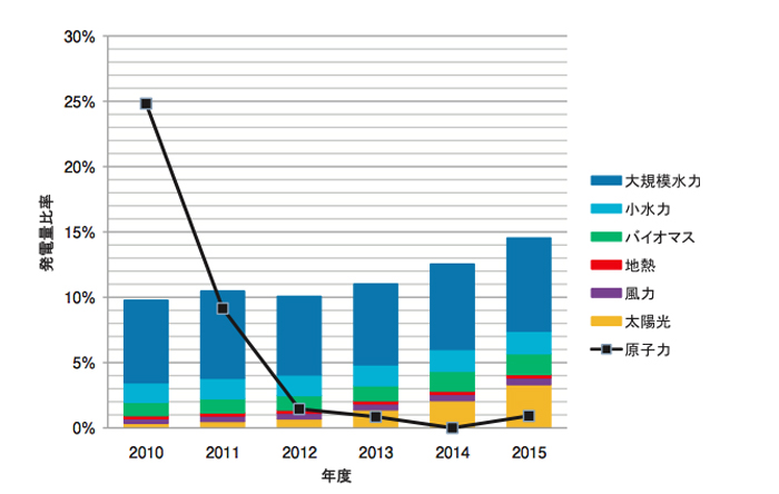 日本国内の自然エネルギーおよび原子力の発電量の推移 (出所:ISP調査)