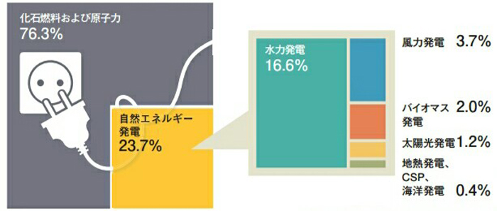 世界では自然エネルギー(再生可能エネルギー)の比率は日本より大きく、全発電量の約24%を占めています。(図5)