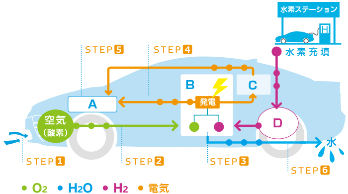 A.モーター B. 燃料電池(発電装置) C. バッテリー(2次電池) D. 高圧水素タンク