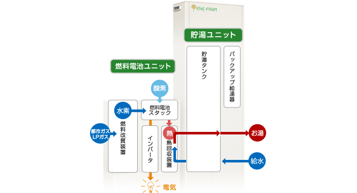 2016年1月時点で約15万台が普及しています。都市ガスやプロパンガスから取り出した水素と空気中の酸素で発電し、その際に発生する熱でお湯を作ることが出来ます。