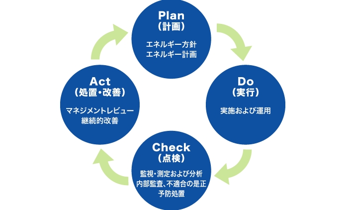 さて、このエネルギーマネジメントシステムにはISO50001という国際規格が存在しており、以下のPDCAサイクルに沿って組織を運用することが求められています(図2)。