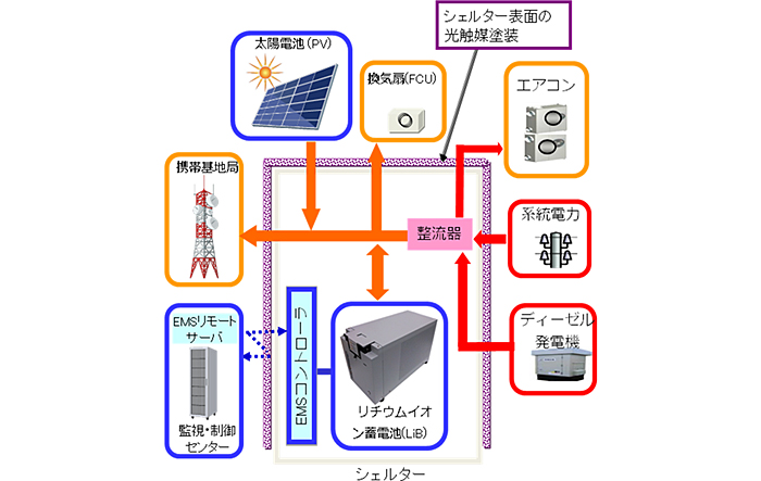 今回の実験で、携帯電話基地局に太陽光発電とリチウムイオン蓄電池を設置したところ、これまで発電用に使っていたディーゼル発電機の燃料を大幅削減できました。また、日中の高温になる基地局内の温度上昇を抑制しエアコンの使用を削減するために、屋根や外壁に光触媒塗料を使って消費電力量を減らした結果、CO2排出量も大幅に削減できたと言います。