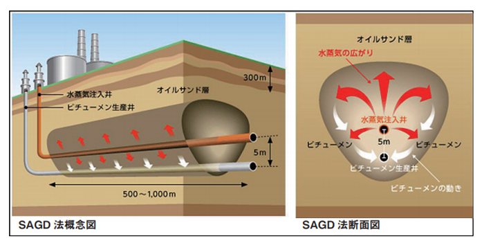 また露天掘りですくい取ることができるのは、比較的浅い部分にあるオイルサンドだけで、地下100メートル以上の深さにたまっているものは簡単に採掘できないため、SAGD法を採用することになります。