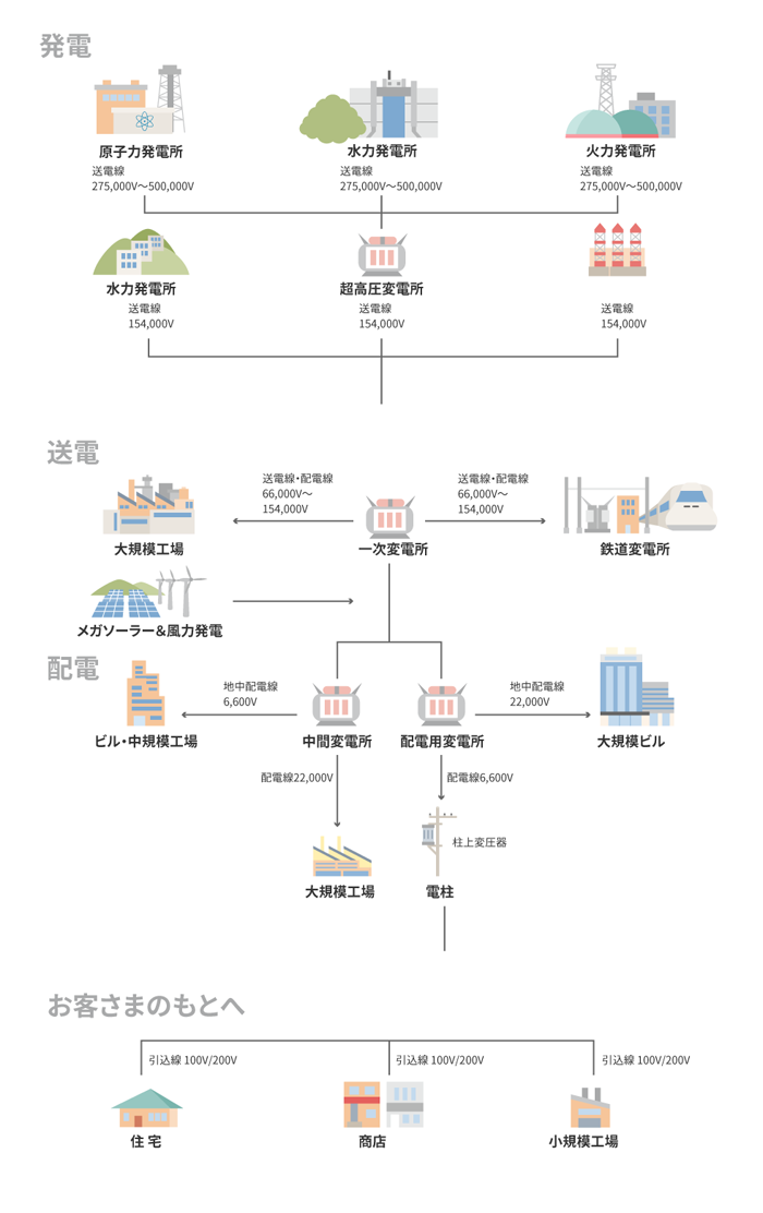 (図1)をご覧ください。まず、火力発電所や原子力発電所などの大規模発電所で作られた電気は、効率よく電気を需要地まで送るため、27.5万~50万ボルトの超高電圧に昇圧して送り出されています。その電気は複数の変電所を経由して、鉄道会社や工場など大量に電気を必要とする需要家や、企業のオフィス、私たちの一般家庭など、それぞれの規模や用途に応じた電圧に降圧して届けられています。