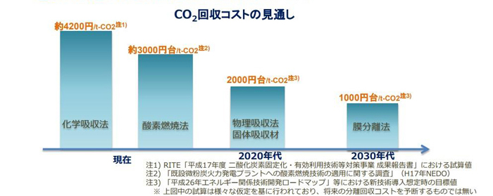 政府は2020年ごろの商用化を目指していますが、鍵となるのは技術革新でしょう。経済産業省のロードマップによりますと、2030年代にCO2の分離コストを1000円台[円/t-CO2]と、現在の約4分の1まで下げようとしています(図4.5)。