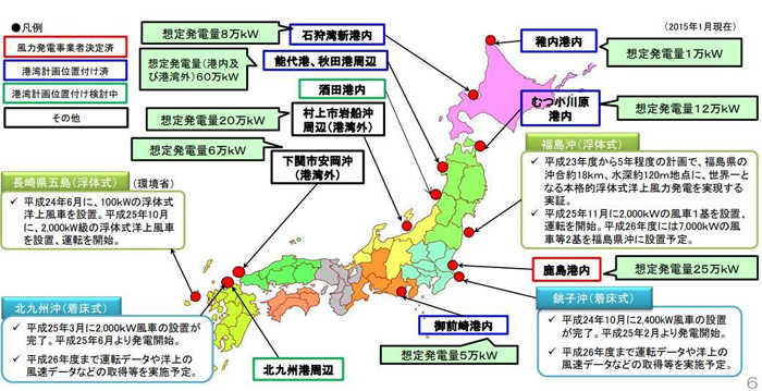 それに加えて現在、港湾内等で計画されている案件のうち、事業者が決定済みで2020年度までに運転開始を予定している案件が約16万kW、その他の事業者案件が約120万kWあることから、2020年度には約13~15万kW、2030年度には約100~110万kWの洋上風力発電の導入を見込んでいます。