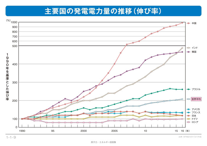 中国のエネルギー消費は、2010年からアメリカを抜いて世界最大になっており、2015年度の時点でのエネルギー消費は世界の22%をも占めています。発電電力量の推移を見ると、中国の伸び率がいかにすごいか、一目瞭然ですね。