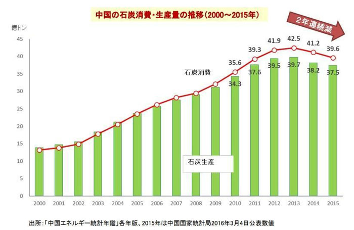 中国の石炭消費・生産量の推移(2000~15年)