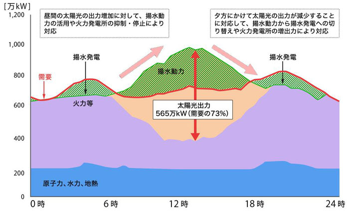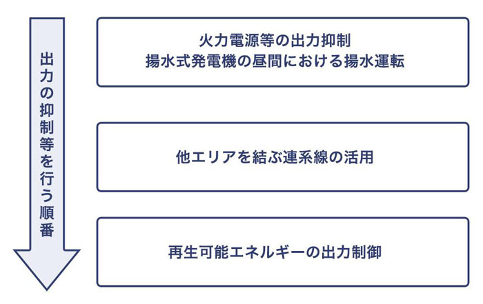 具体的には、電気が余ったら、最初に火力発電が発電量を減らします。次に揚水式発電機の動力(下から上の貯水池に水をくみ上げる)として電気を使う、さらに電力会社間をつないでいる連系線を活用して他エリアに電気を流す、それでも余る場合には再エネの出力を制御する、と続くことが定められています。