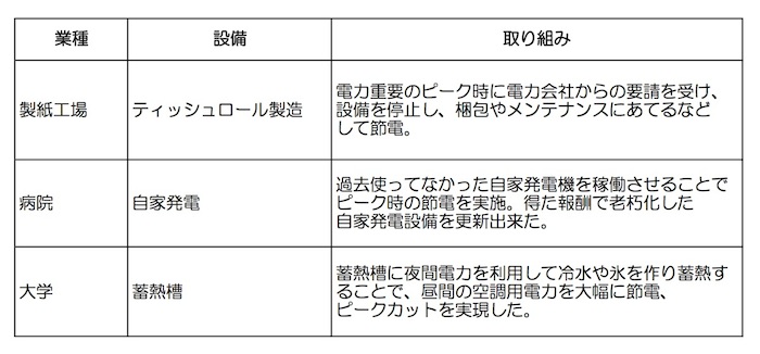 「ネガワット取引」はこの4月1日から制度化され、「ネガワット取引市場」がスタートします。概念的にわかったような気がしても、では具体的にどういうものなのか、ピンと来ない方もいらっしゃるでしょう。幾つか例を挙げてみましょう。