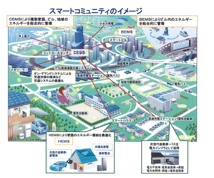 それぞれの家は、太陽光発電システムや燃料電池、蓄電池(EV:電気自動車含む)などを組み合わせることにより、より総合的な制御が可能になります。そうした家は「スマートハウス」と呼ばれ、それらが集まって「スマートシティ」になります。すでにそうした試みは始まっています。