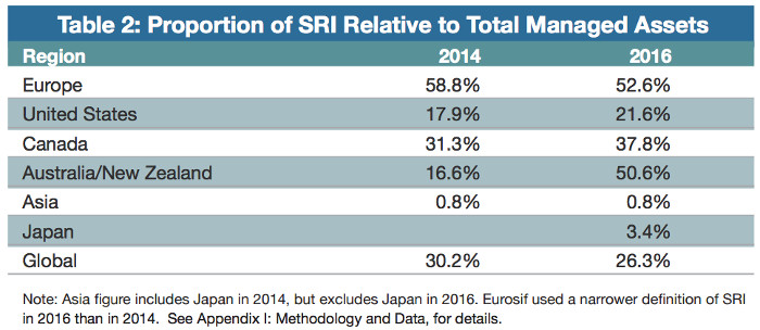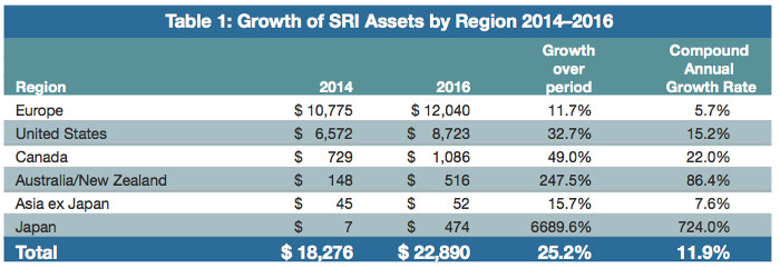 世界持続可能投資連合(GSIA)によると、世界のESG投資額は2016年に22兆8,900億米ドル(約2,590兆円:1ドル=113円で計算)となっており、2014年からは25.2%成長しました。これは世界の総投資額の約26%に当たり、ESG投資が盛んな欧州に至っては投資額の約53%に当たるなど勢いが加速しています。また日本も規模はまだまだ小さいながら、2014年から2016年の2年間で投資額がなんと約68倍に増えています。