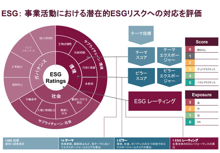 主なESG評価専門機関には、「FTSE ESG Ratings」「MSCI ESG Ratings」「Sustainalytics Company ESG Reports」などがあります。例えば、世界最大の指数提供会社の一つであり、世界4500社以上の会社を評価対象としている「FTSE ESG Ratings」の評価手法が次の図。環境、社会、ガバナンスの3つの分野を、さらに細分化して潜在的なリスクへの対応力を評価しています。