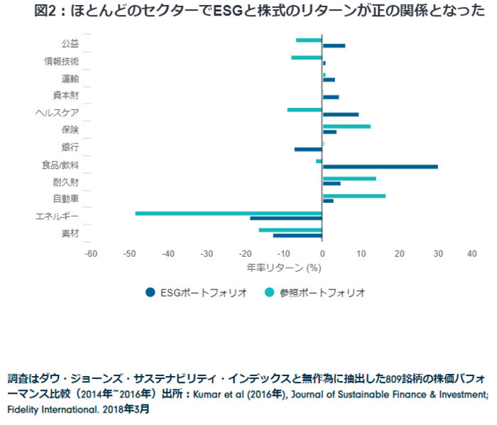 まず、企業イメージやブランド価値の向上が挙げられます。さらに、実際の投資額が増える、株価が上がるなど、経済面でのメリットもあると言えるでしょう。ファイナンシャルサービス企業であるフィデリティ・インターナショナルの調査によると、業界ごとのばらつきが大きいものの、ESGの評価が高い企業が、そうでない企業より株式のリターンが向上し、全体的なボラティリティ(価格の変動性)が低いことが明らかになりました。