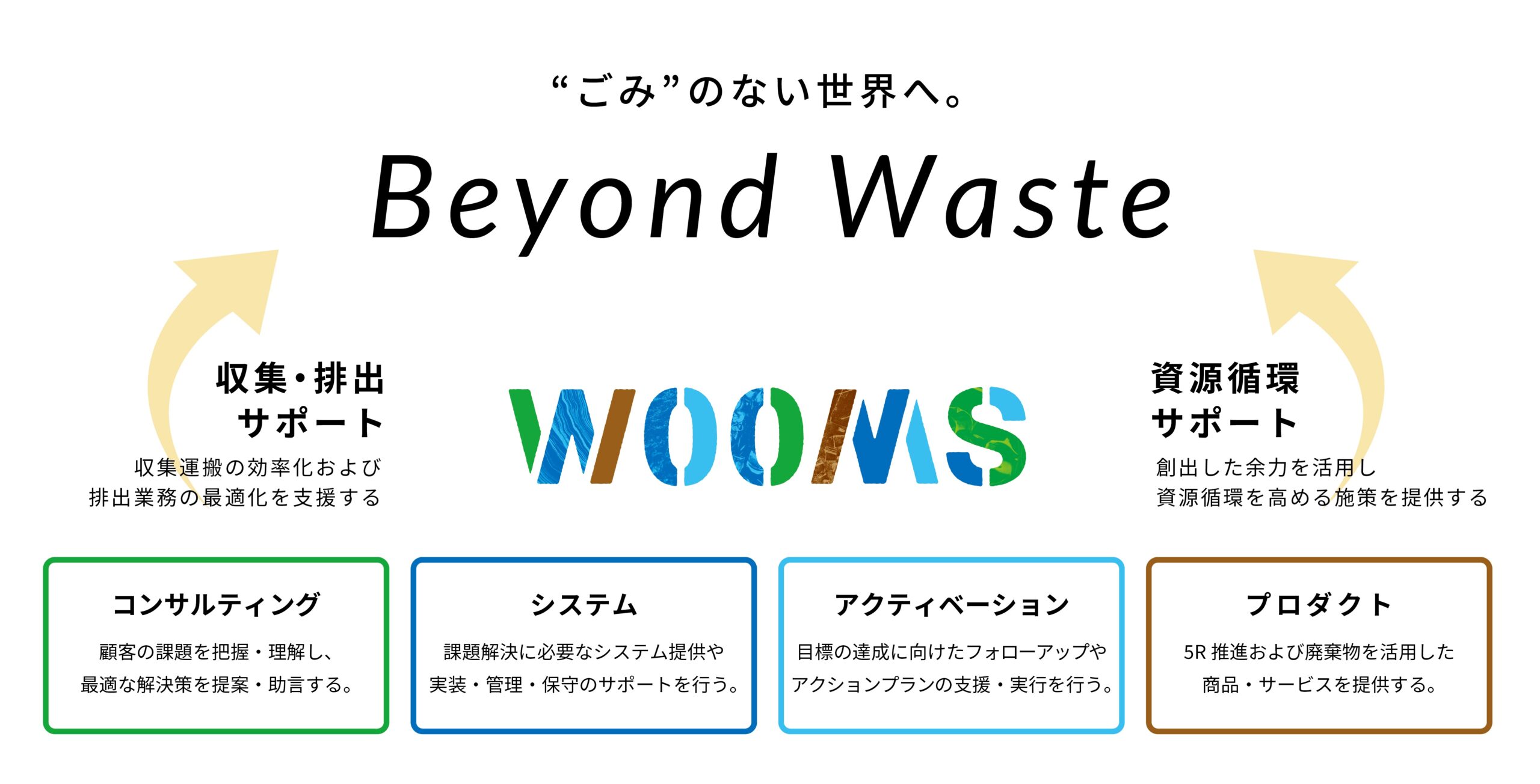「“ごみ”のない世界へ。Beyond Waste」を事業ビジョンに掲げるWOOMSは、資源・廃棄物に関わる自治体と事業者を対象としたサービスである。