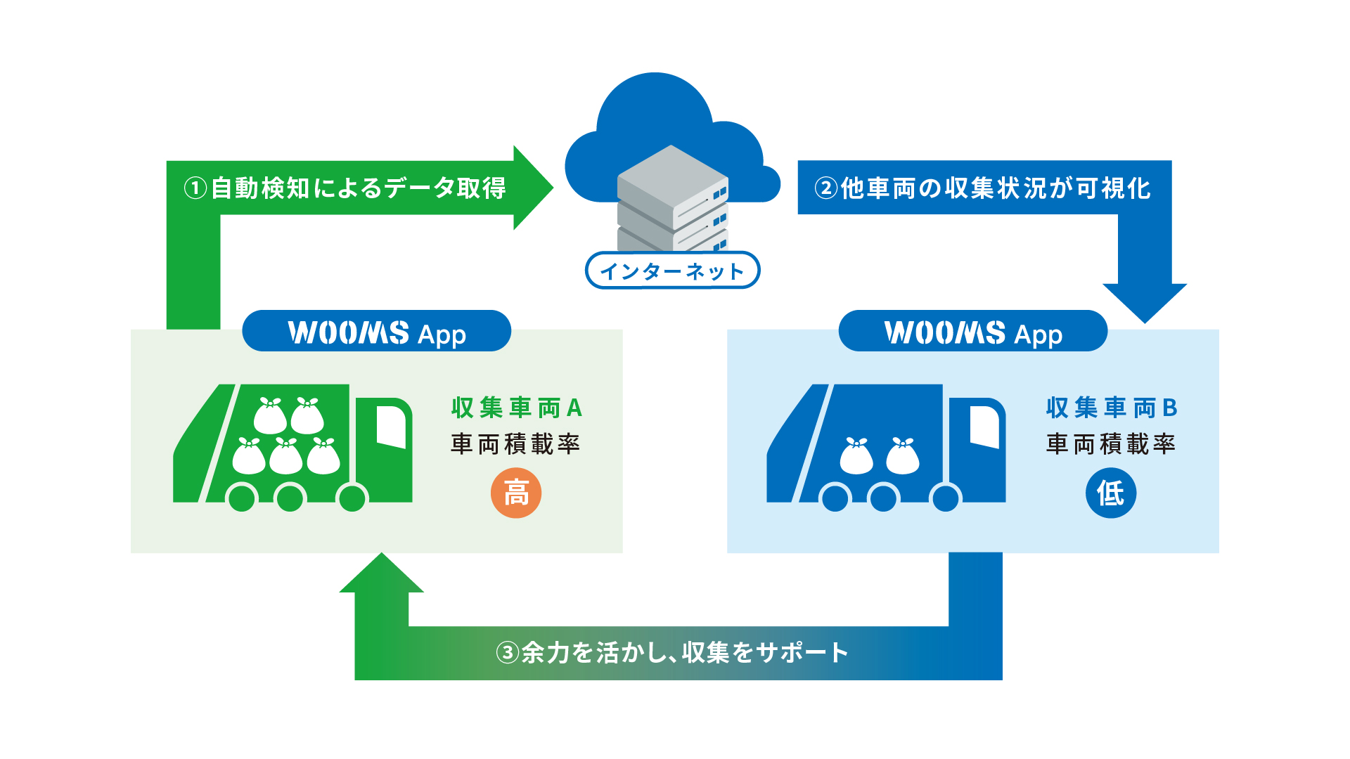 収集時の連携イメージ。収集車に搭載したタブレット端末にアプリケーション「WOOMS App」がインストールされており、ネット上の管理ポータルシステムとやりとりすることで各車両の状況をリアルタイムに共有し、迅速なごみ収集の連携を実現している