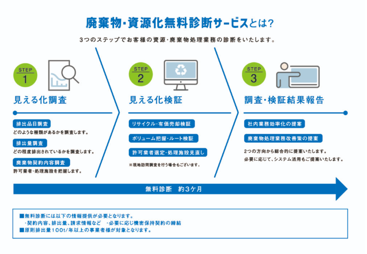 WOOMS Connectでは、「見える化調査」「見える化検証」「調査・検証結果報告」の3ステップで、約3カ月かけて資源・廃棄物処理業務の診断を行う。しかも、この診断は無料で対応してもらうことが可能だ
