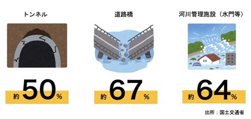 2033年時点で、国内の各インフラが建設後50年以上となる割合