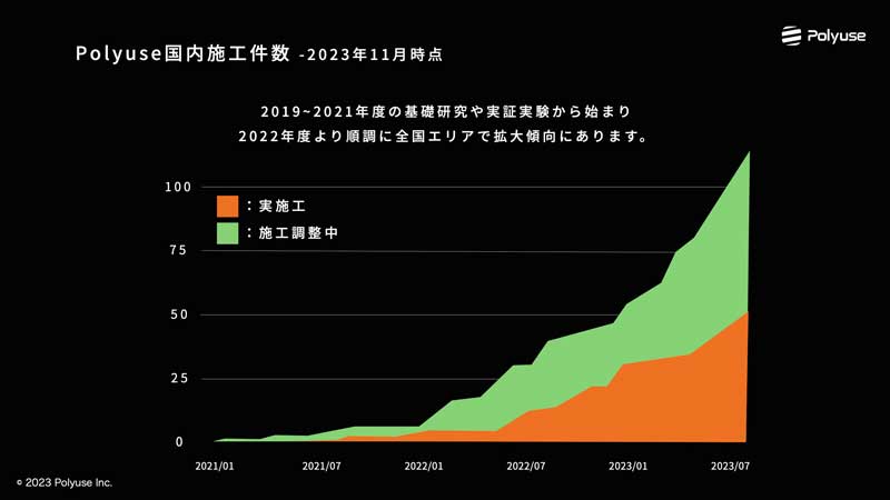 現在、国内で施工された3Dプリンターでの公共工事事例のうち、およそ9割をポリウスが受注している。2023年度中には通算の施工数が100件を突破する見込みだが、公共工事での導入を主軸としながら、実証面である耐久性や施工時の効率といったデータも蓄積し、分析、活用を進めている。
