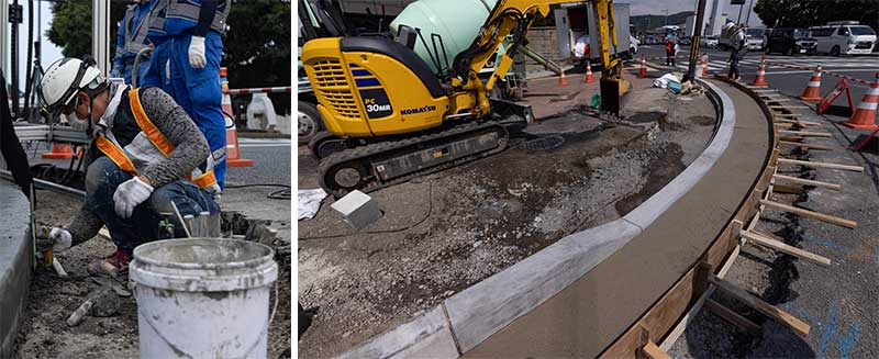 「国道24号河原町十条地区電線共同溝工事」では、構造物を印刷しながら左官作業を実施(画像左)。表面を均(なら)し、仕上げを行い職人とテクノロジーを共存させつつ工程を一度に進めることで、さらなる効率化に成功した