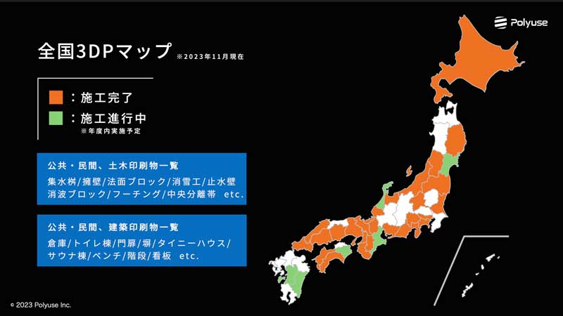 ポリウスが手掛けた建設用3Dプリンティング技術による施工を示したマップ(施工進行中も含む)。公共事業では、擁壁、護岸ブロック、消波ブロックなど防災能力の高い構造物の印刷でも各地で実績を積んでいる