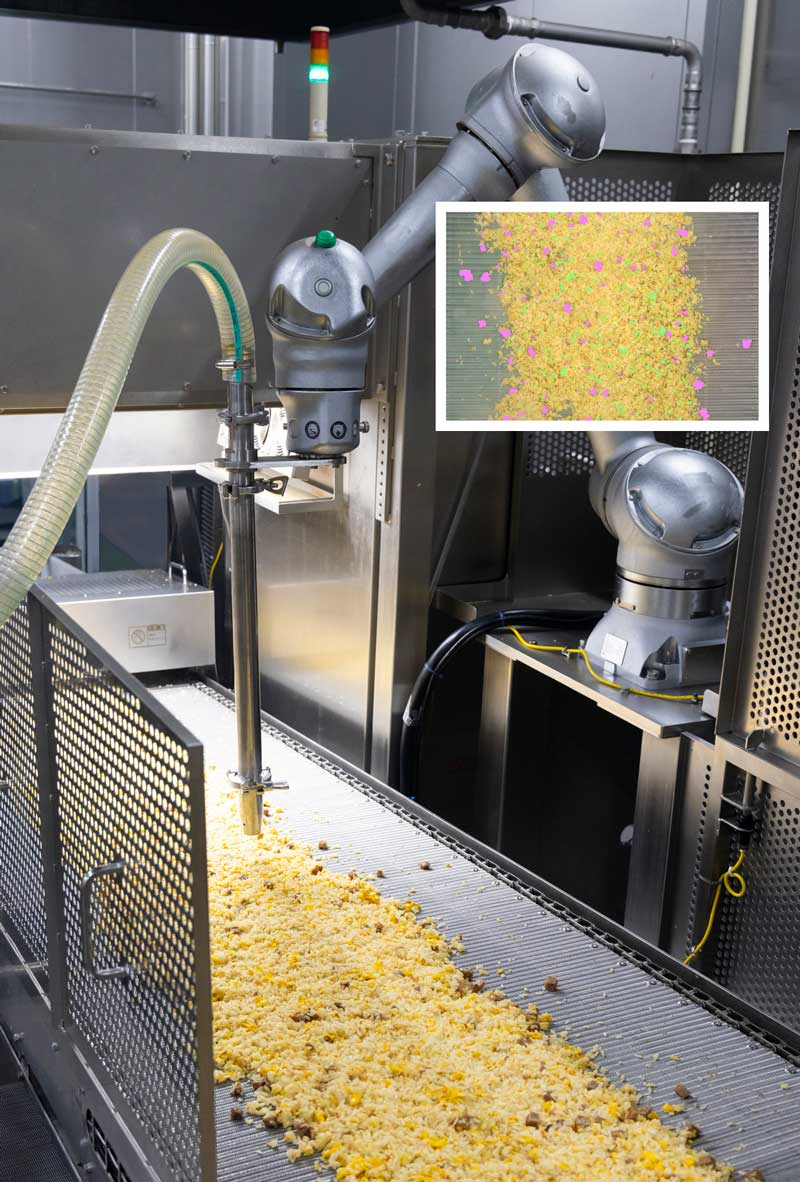 ライン上を流れる炒飯をカメラで撮影した画像からAIで「こげ」を検知し、ロボットアームで吸い上げる画期的な技術