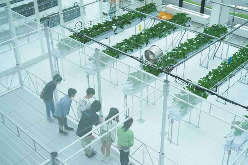 TECH LABで栽培されるイチゴ。潅水(かんすい)と施肥は株式会社ルートレック・ネットワークスが開発したシステム「ゼロアグリ」によりAIで最適化。来館者は、アグリテックが農業の社会・環境課題を解決する様子や栽培プロセスを間近で見ることができる