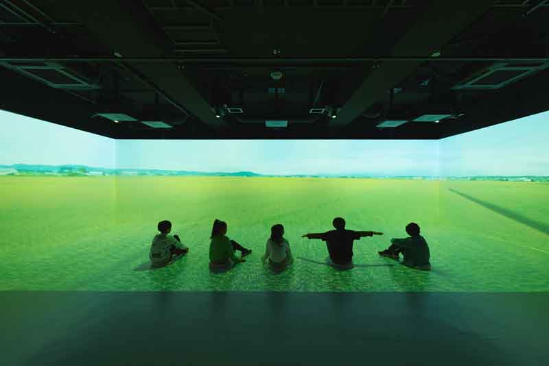 THEATERでは「食や農業の素晴らしさ」と、そこに関わる課題をフードバリューチェーン全体で解決する大切さを知る映像プログラムを上映。正面左右の壁面に加え、床面にも映像が投影される没入型映像空間だ