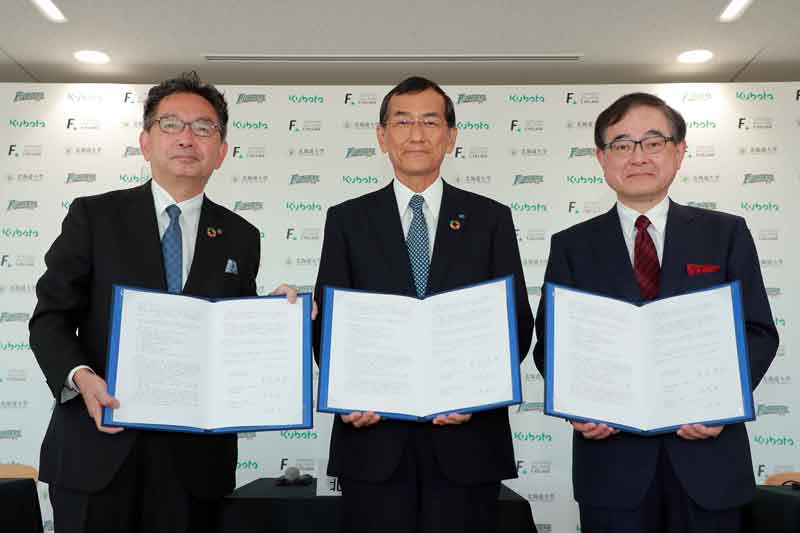 2021年10月、クボタはFSE、北海道大学とFビレッジ内における農業学習施設の設置についての3者連携協定を締結。川村浩二FSE社長(当時・左)、北尾裕一クボタ社長(中央)、寳金清博(ほうきん きよひろ)北海道大学総長(右)