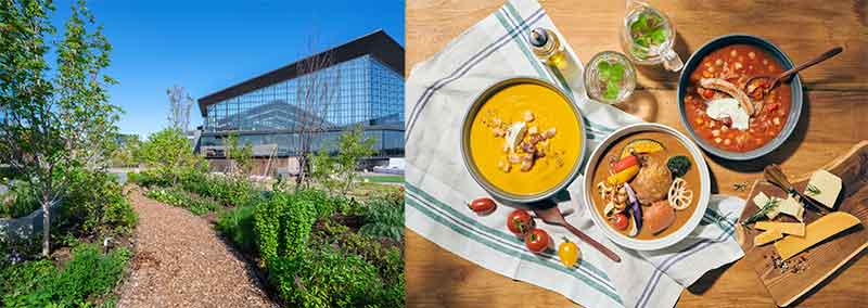 POTAGE GARDENではさまざまな花、ハーブ、果樹を栽培。露地栽培エリアでは、隣接するキッズラボ ボールパークこども園向けの食育活動も実施している。収穫された農作物は併接するCAFEのメニューとしても使用。CAFEでは道産のお米や農作物を使用したメニューを用意する