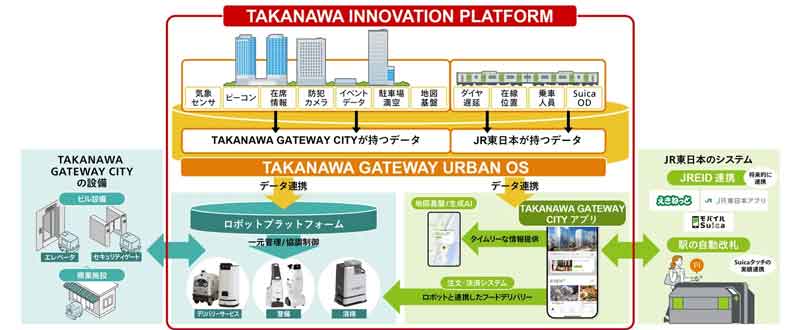 TAKANAWA INNOVATION PLATFORMはJR東日本とKDDI株式会社が開発。「TAKANAWA GATEWAY URBAN OS」にまちや鉄道のデータを集約、そのデータを TAKANAWA GATEWAY CITYアプリやロボットプラットフォームで活用する