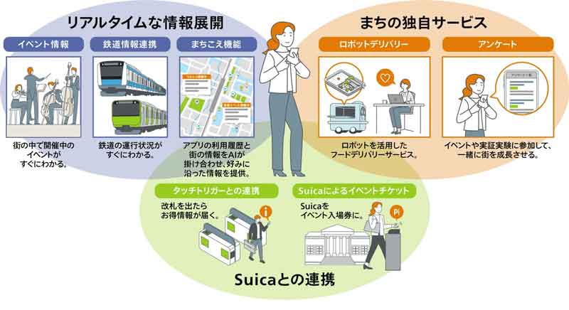 「TAKANAWA GATEWAY CITYアプリ」はJR東日本のICカード「Suica」との連携、生成 AIによる情報提供を行い、利用者の興味・関心に合った情報をタイムリーに提供する