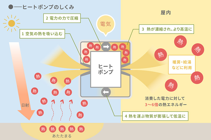また、ヒートポンプの仕組みは、化石燃料を燃焼させて熱を発生させるものではありません。