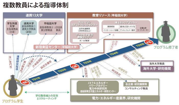 PEPは早稲田大学を含む国内13大学が連携するほか、国内の企業や研究機関、海外の大学とも共同研究のパートナーシップを取っている。注目したいのは、早稲田大学以外の12大学の学生は、自らの大学に学籍を置きながらPEPのカリキュラムを受講でき、その単位は在籍大学の単位として認められるという、これまでになかった取り組みだ。これにより、他大学の学生や企業の研究者など、従来の博士課程の中では難しかった人脈を得るチャンスを手にすることもできる。