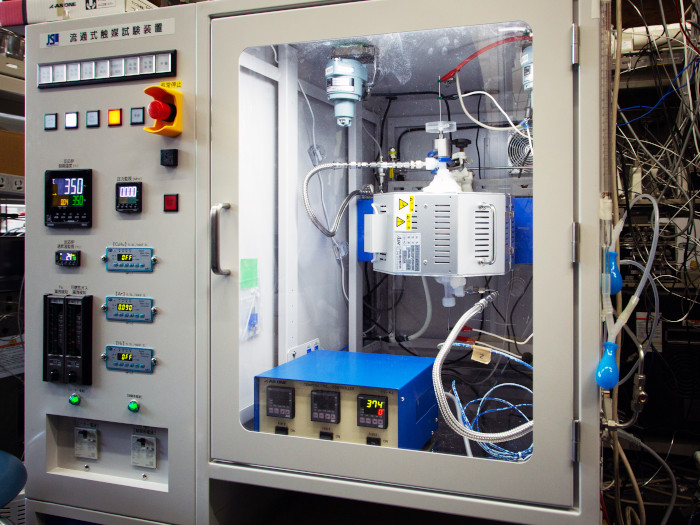 実験装置の中央にある銀色の容器内に触媒を入れて直流電流を流し、CO2と水素を入れて反応を起こす