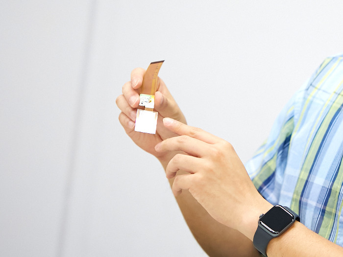 薄さは15㎛。この日は手に持って説明できるよう、透明なプラスチックの板にイメージセンサーを貼って補強してくれたため、このように持ち上げることもできた
