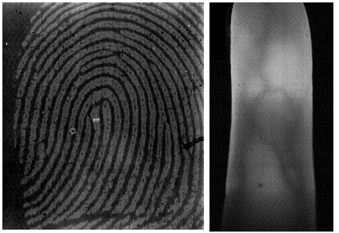 今回のイメージセンサーで撮像した指紋(左)と静脈(右)。今回の形状のものを手首に付けた場合は、逆の手の指で指紋のセンサーに触れれば同時計測が可能だ