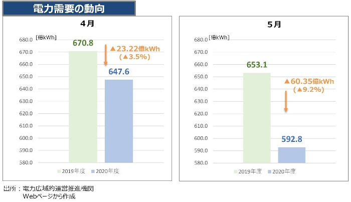 2020年の4月と5月の全国の電力需要は前年比でそれぞれ3.5%、9.2%減少した